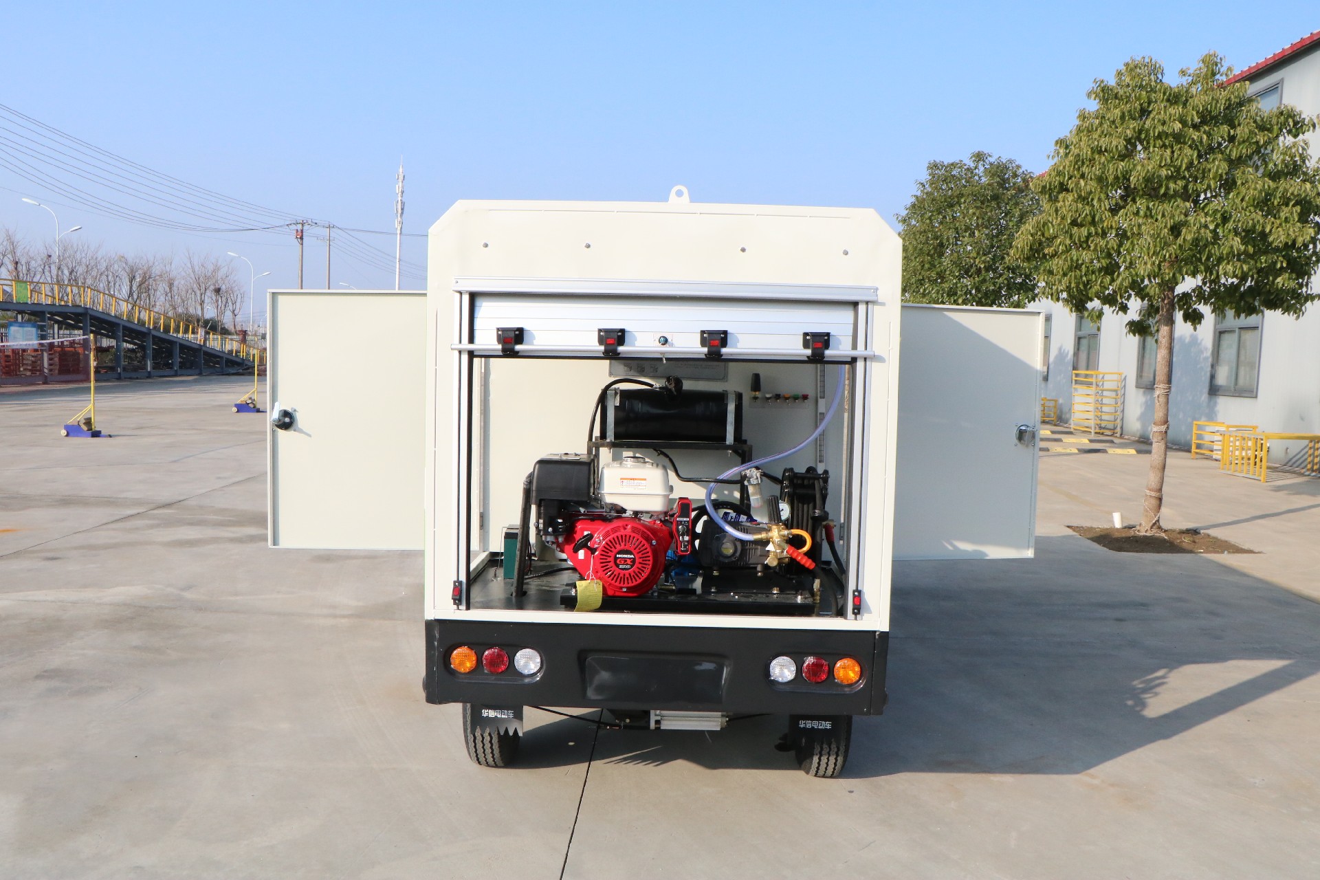 7 | 配備旋轉噴頭和噴桿,可以滿足沖洗和灑水功能,同時配備高壓水槍,可有效清除城市中小廣告、道板、護欄、路牙的死角等部位。 |